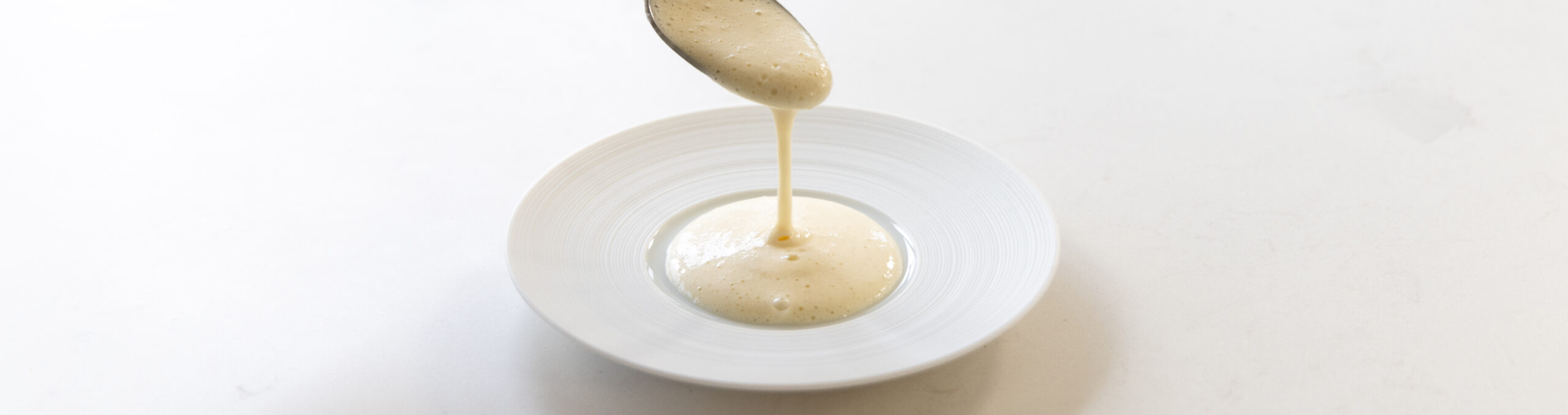 - Transfer it into a saucepan and add the crème fraiche. Blend it with a hand blender to emulsify it and to create a beautiful foam.