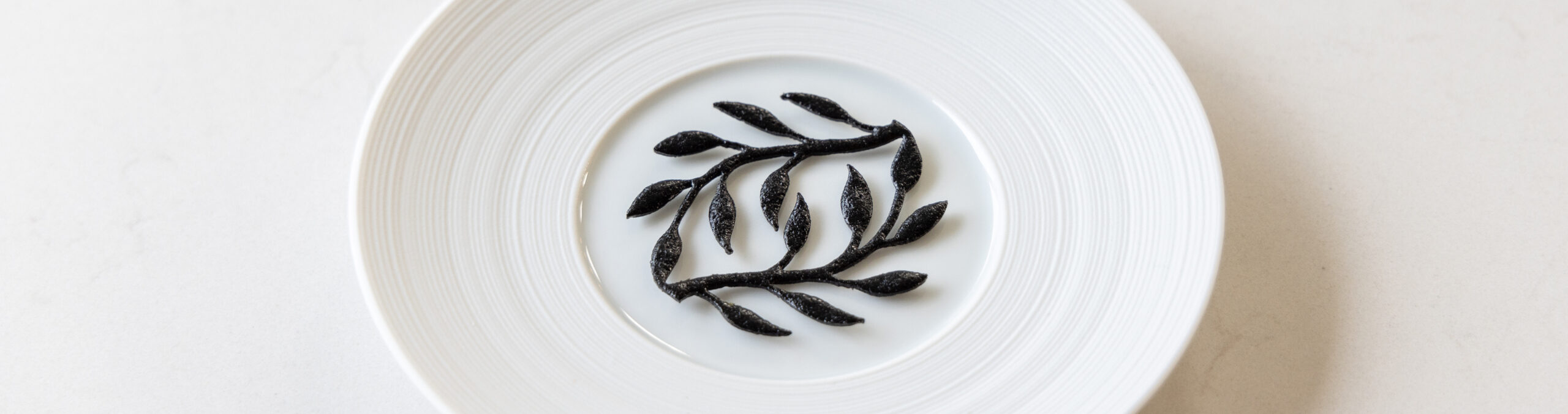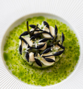- Mix the egg white with the cane sugar, the pine tree nuts, the butter, the salt and the squid ink. Blend this till smooth.