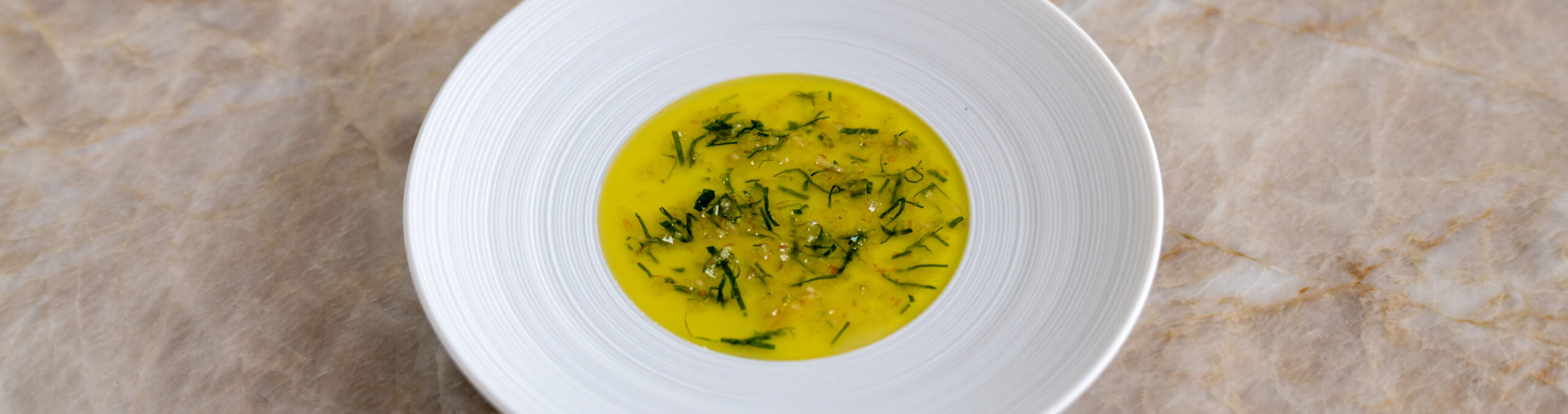 - Transfer the shallot into a bowl and then cut the wild garlic leaves in a thin chiffonade. That’s a technique used to finely cut herbs. Add it to the shallot together with the dashi vinegar, the sushi vinegar and the zest from the lime.